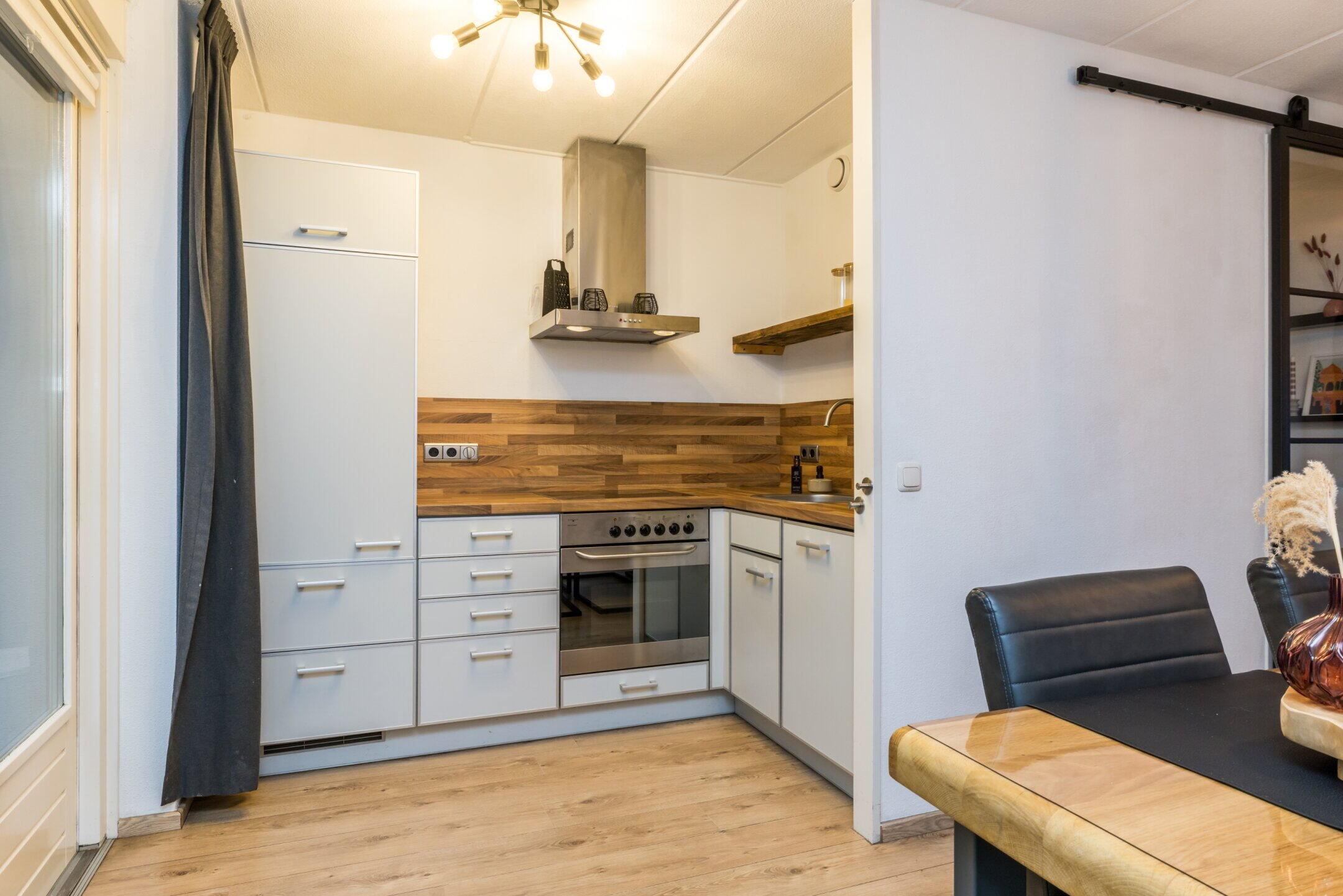 De keuken in hoekopstelling is voorzien van de navolgende apparatuur: kookplaat, afzuigkap, elektrische oven, koelkast en vaatwasser.
